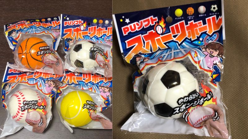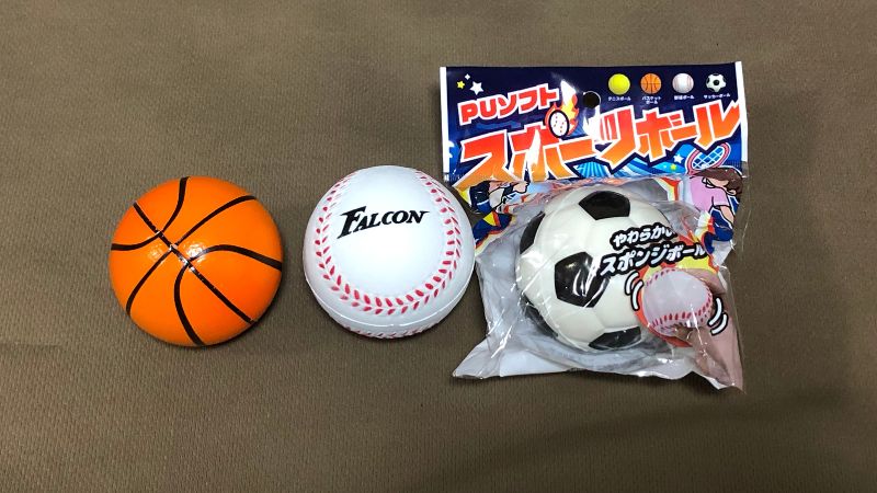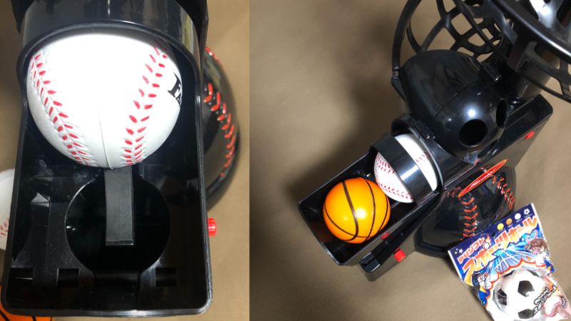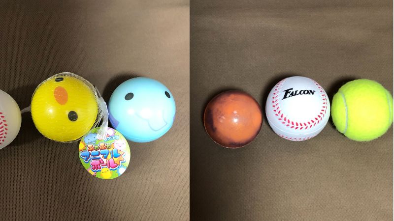 「PUソフト スポーツボール」の他に、「ふわふわアニマルボール」や「ソフト天体ボール」、「テニスボール」もありましたが、ふわふわアニマルボールは柔らかく、サイズが少し大きくて詰まりが発生、ソフト天体ボールは使用できましたが、小さくて軽いためより高く飛びます。テニスボールは重くてほとんど飛ばないので使用できませんでした。