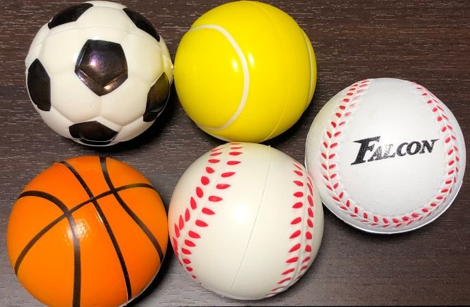 PUソフト スポーツボール種類は、バスケットボール、サッカーボール、野球ボール、テニスボールの4種類